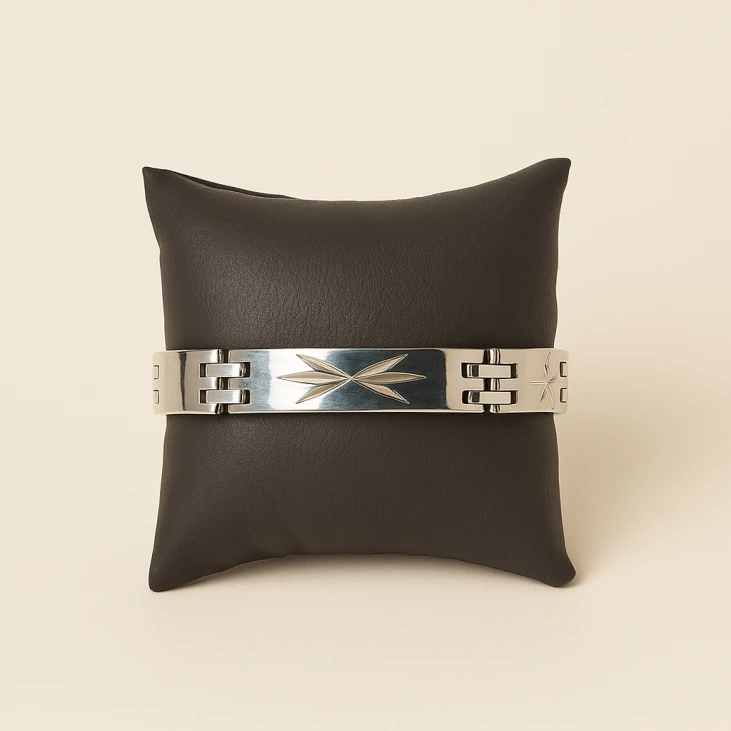 Men's silver-tone stainless steel bracelet featuring bold star motifs on wide links. Measuring 20 cm in length and weighing 27-28g, this structured design makes a confident statement for everyday wear.