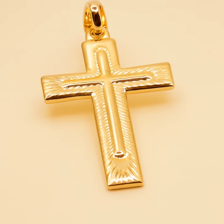 Awaken your elegance with this gold-plated medallion, where light dances along its rectangular edges and the open cross symbolizes spirituality and love.
