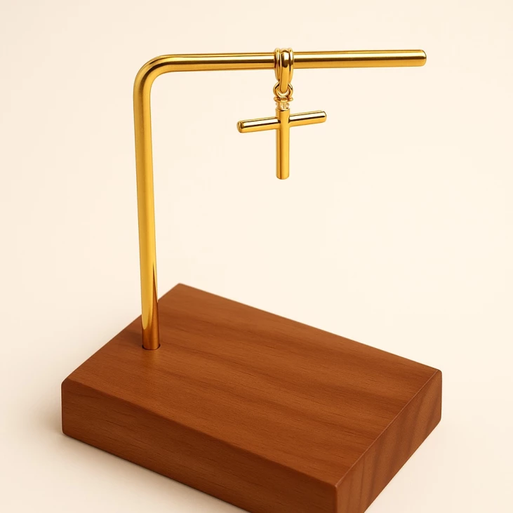 Awaken your elegance with this gold-plated medallion, where light dances along its rectangular edges and the open cross symbolizes spirituality and love.